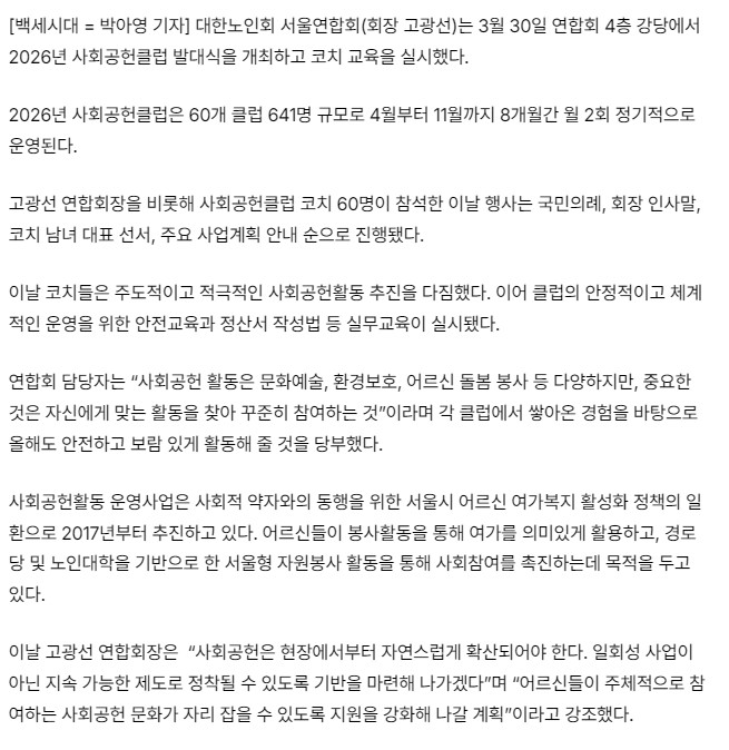 대한노인회 서울시연합회, ‘2026년 사회공헌클럽 발대식 및 코치 교육’ 페이지 정보 작성자 대한노인회서울시연합회 작성일2026-04-03 08:48 조회17회 관련링크 다음글 목록 본문 대한노인회 서울시연합회, ‘2026년 사회공헌클럽 발대식 및 코치 교육’ 다음글 목록
